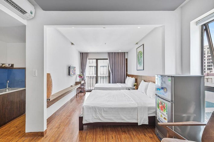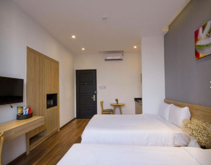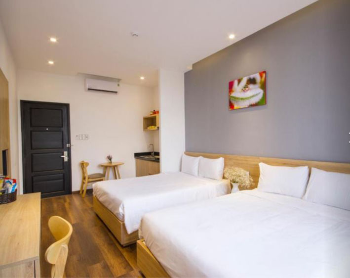 + Khách sạn có 22 phòng nghỉ được thiết kế tinh tế, mang phong cách hiện đại và ấm cúng. Mỗi phòng đều được trang bị đầy đủ tiện nghi như điều hòa, TV màn hình phẳng, minibar, vòi xịt hiện đại… đảm bảo mang đến trải nghiệm lưu trú thoải mái nhất. Đặc biệt, một số phòng có khu vực bếp riêng với tủ lạnh và lò nướng. Phù hợp cho khách lưu trú dài ngày hoặc những ai muốn tận hưởng sự tiện nghi như ở chính ngôi nhà thứ hai.