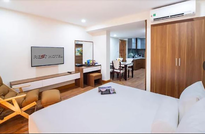👉Rest Hotel & Apartment sở hữu 60 phòng và căn hộ cao cấp, được thiết kế tinh tế. Mỗi không gian đều chú trọng ánh sáng tự nhiên, tầm nhìn thoáng đãng và nội thất tiện nghi hiện đại.